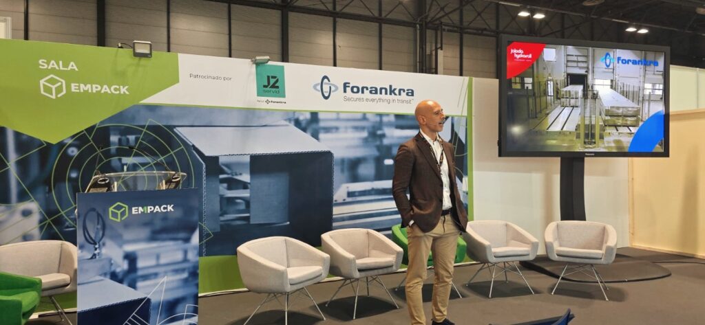 Este año, además, dimos un paso más al convertirnos en patrocinadores oficiales de la Sala Empack, el espacio donde se analizaron las principales tendencias y retos del sector del envase y embalaje. En este marco, acogimos la ponencia “Reducción de costes y sostenibilidad en los procesos de carga de camiones”, presentada por David J. Giménez, Director de Ventas de Joloda Hydraroll Ltd. para Iberia y LATAM. Una intervención que puso el foco en la automatización como herramienta clave para optimizar recursos y reducir el impacto ambiental en la logística.